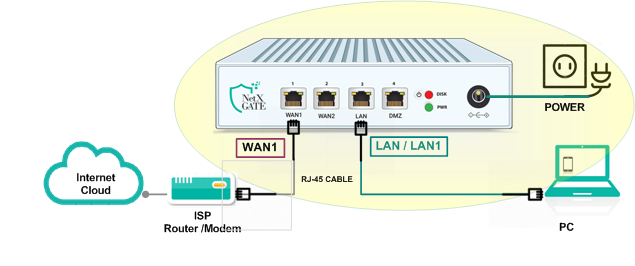 Step-2: Plugin the one end of RJ-45 Ethernet cable in LAN or LAN1 interface and another end with your Laptop / PC.