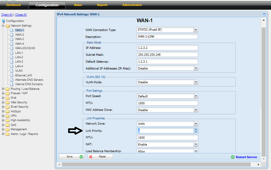 If selected Fail Over / Load balance, then define the Link Priority /weight-age in which you want the traffic to be distributed among the lines. ( That you can configure Under Configuration > network Setting > WAN > Link properties .