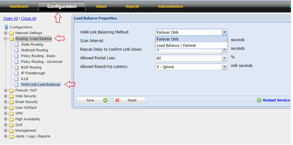 4: Under Load balance properties , < Here select the mode in which you want to configure multiple links > - Select Failover only or Load Balance / Failover according to requirement under WAN Link balancing Method.